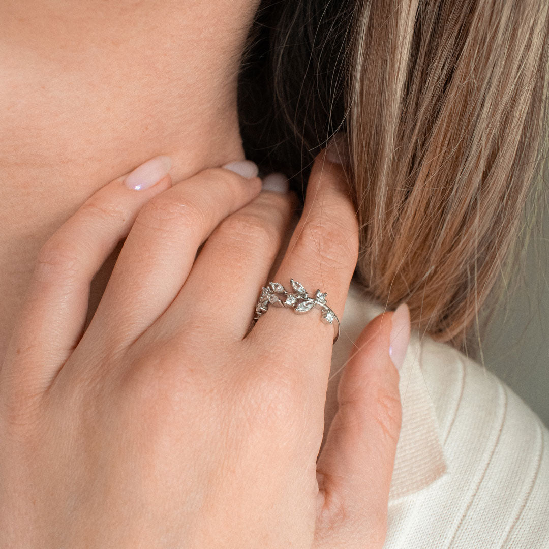 An enchanting open ring featuring dainty leaves with cubic zirconia crystals. Subtle yet elegant, it's made to emphasize minimalism in your style.