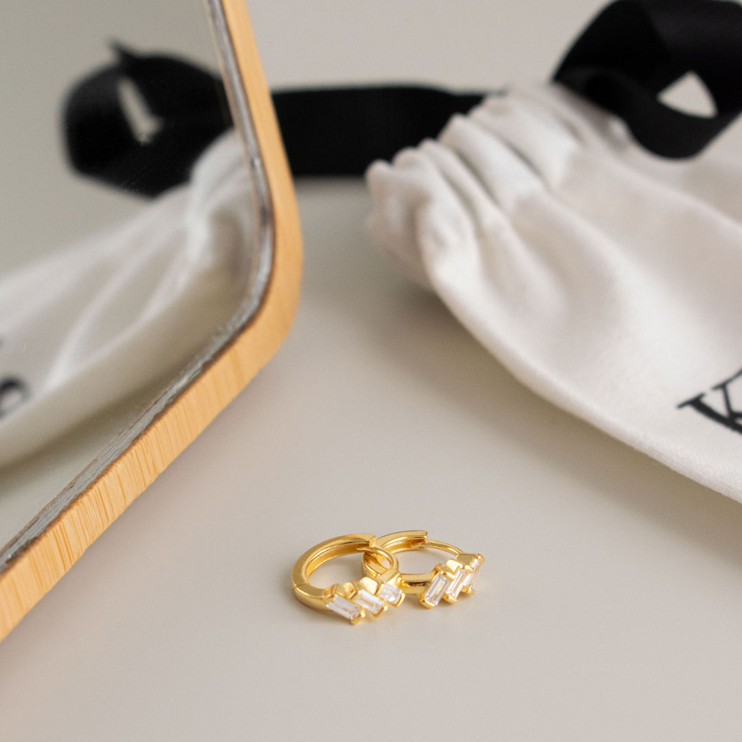Add a touch of sparkle to your everyday style with these dainty huggie earrings. Each hoop is set with shimmering baguette-cut zircon stones and designed to hug the ear just right. Lightweight, elegant, and perfect for stacking or wearing solo. Whether you're dressing up or down, they’re your new go-to for effortless shine.
