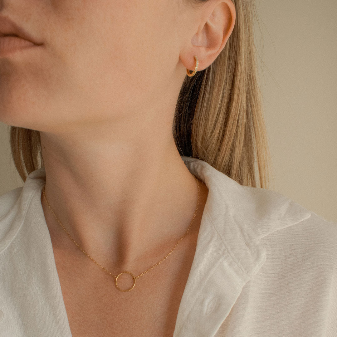 Two pieces, one effortless look. Gold-plated zircon sleeper hoops paired with a delicate necklace featuring a circular center ring. Minimal, polished, and just the right amount of sparkle - made to look put-together without trying too hard.