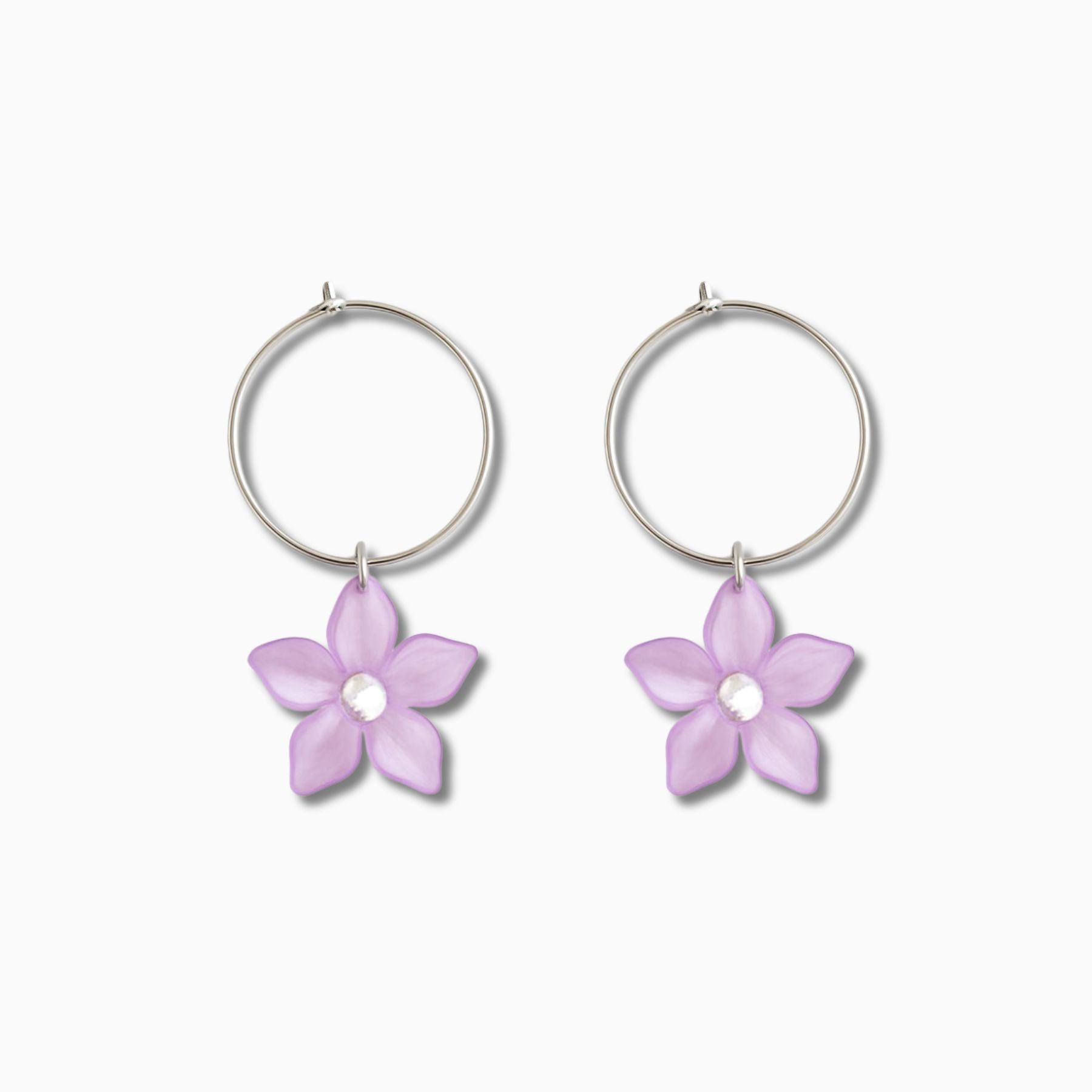 Add a touch of spring to your style with these delicate Flower Earrings. Featuring translucent lilac flower charms with a sterling silver center, these lightweight hoops bring effortless elegance to any outfit.