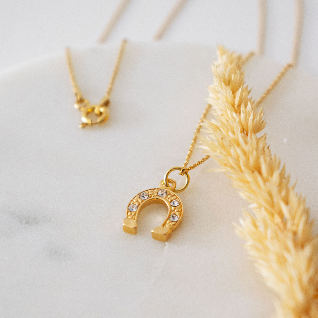 This dainty necklace is made of sterling silver and covered in 18k gold plating. Comes with a pendant featuring horseshoe, which is a symbol of fortune and style. Affordable high-quality jewelry for everyday wear or special occasions.